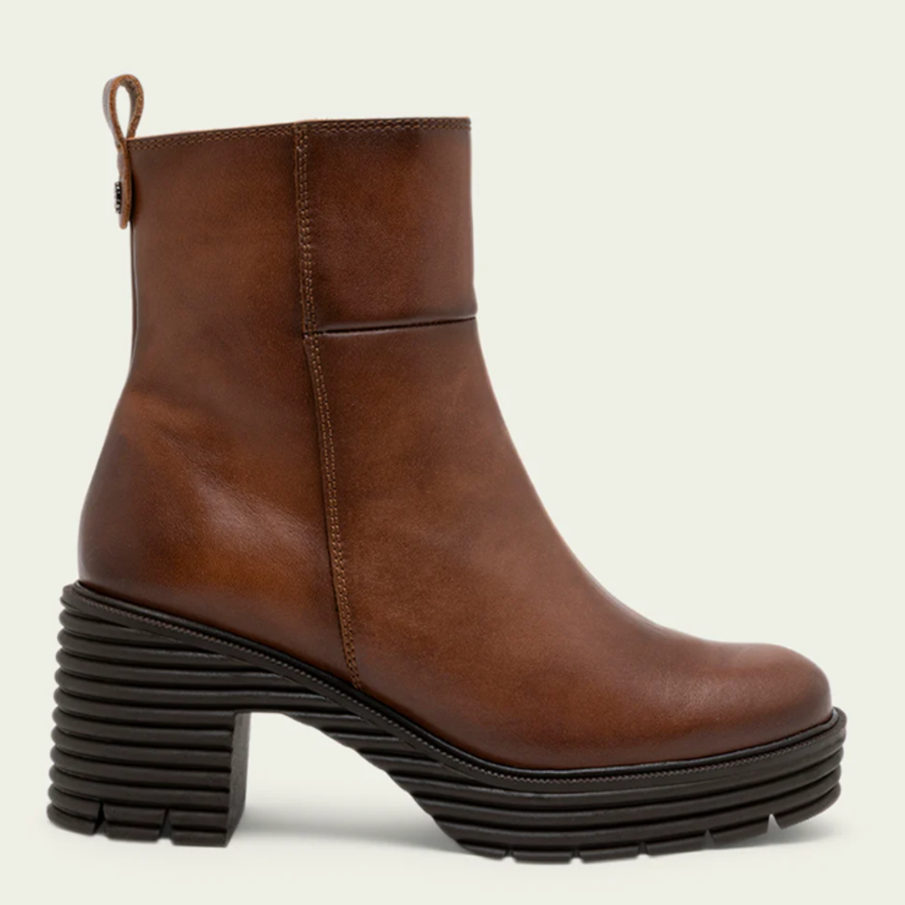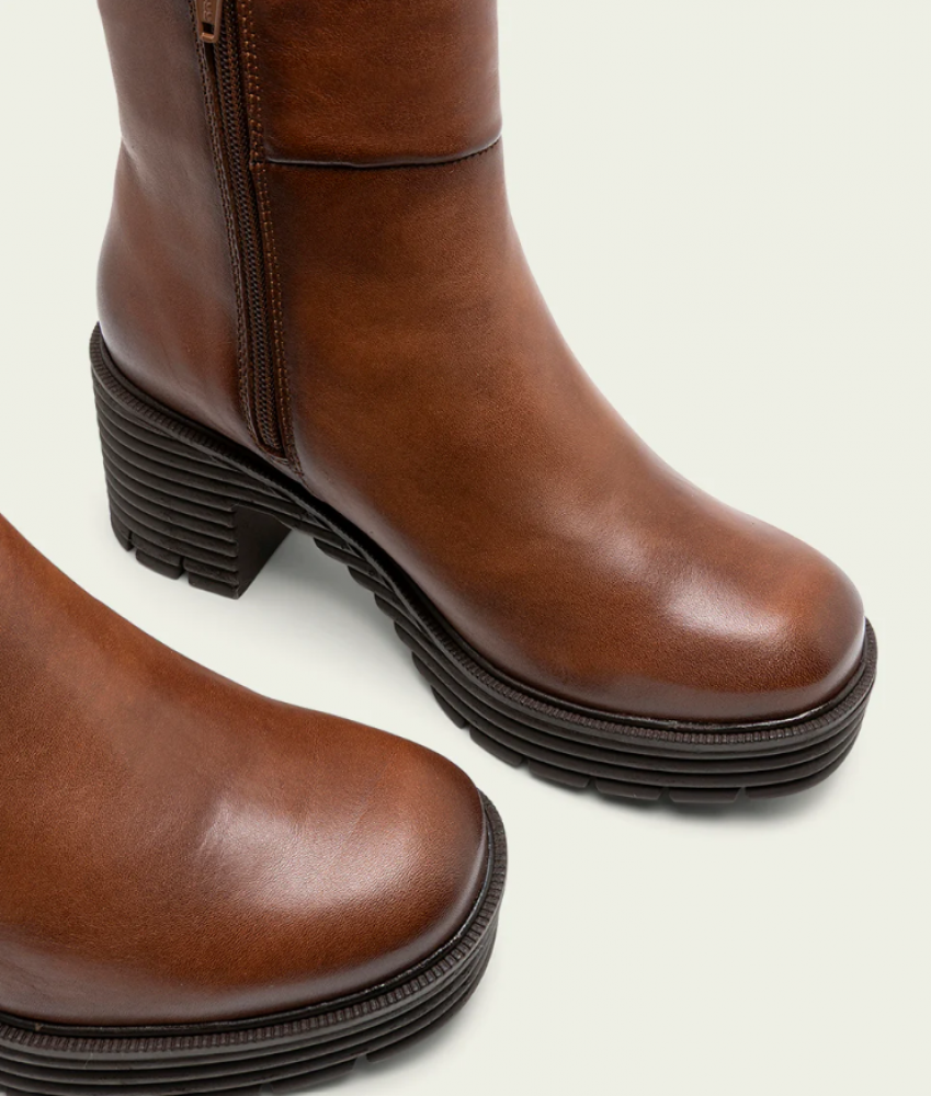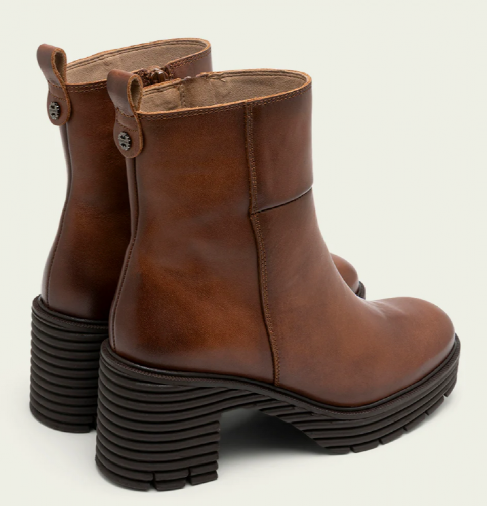 Botines de piel con piso track con tacón de 6,5 cm y plataforma de 2,5 cm. Cremallera lateral interior para facilitar el calce. Plantilla y forro de microfibra con acabado confort aterciopelado. Elaborado 100% en España.