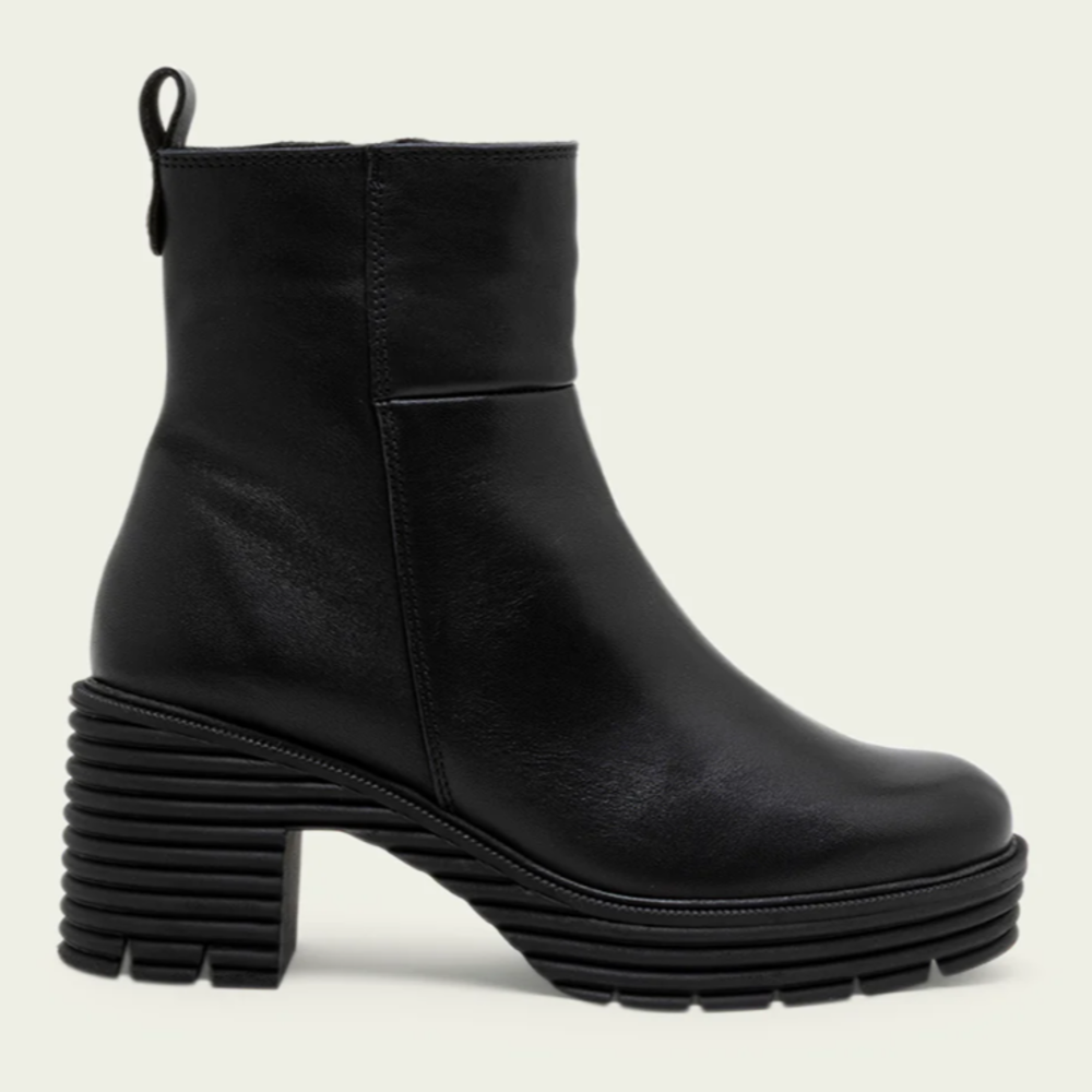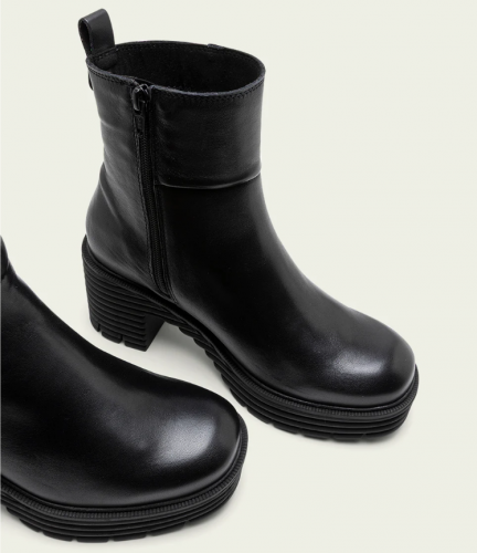 Botines de piel con piso track con tacón de 6,5 cm y plataforma de 2,5 cm. Cremallera lateral interior para facilitar el calce. Plantilla y forro de microfibra con acabado confort aterciopelado. Elaborado 100% en España.